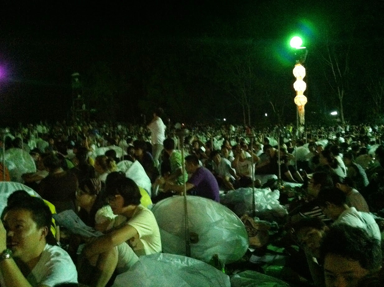 ...and our green-shirted friends tried their best in very broken English to guide people over to the sides by the little reservoirs - obstructed view, but at least they were inside. Meanwhile, thousands of other patrons that couldn't get in started lighting lanterns outside the event space. You could feel the excitement and anticipation building.